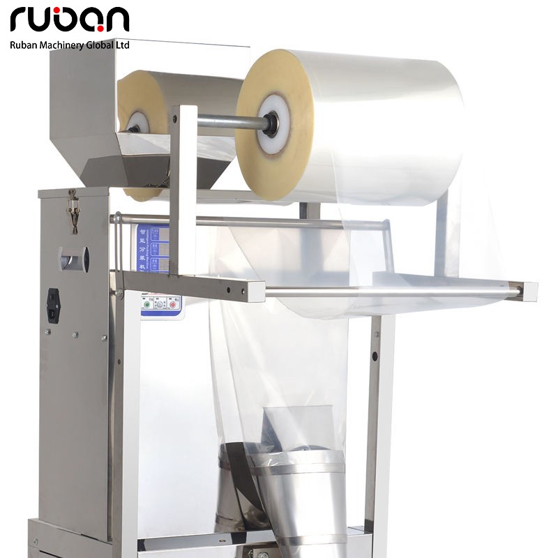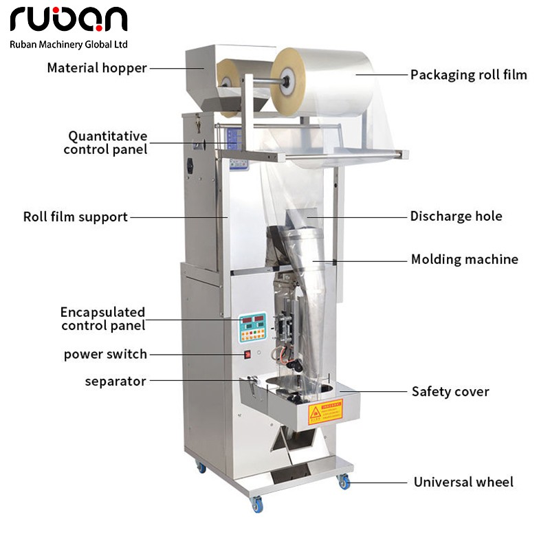 Esta máquina de envasado vertical de gránulos es un dispositivo integrado totalmente automático con cuerpo de acero inoxidable, equipado con estructuras integradas como alimentación de film en rollo, dosificación precisa, formación y sellado de bolsas. Incorpora ruedas universales en la base para facilitar su desplazamiento. La máquina es adecuada para el envasado en bolsas pequeñas de diversos materiales, como té, medicamentos granulados, accesorios de ferretería y alimentos granulados. El ajuste de parámetros se realiza mediante un panel de control visual, lo que permite un proceso totalmente automatizado desde el llenado del material hasta la salida del producto terminado.