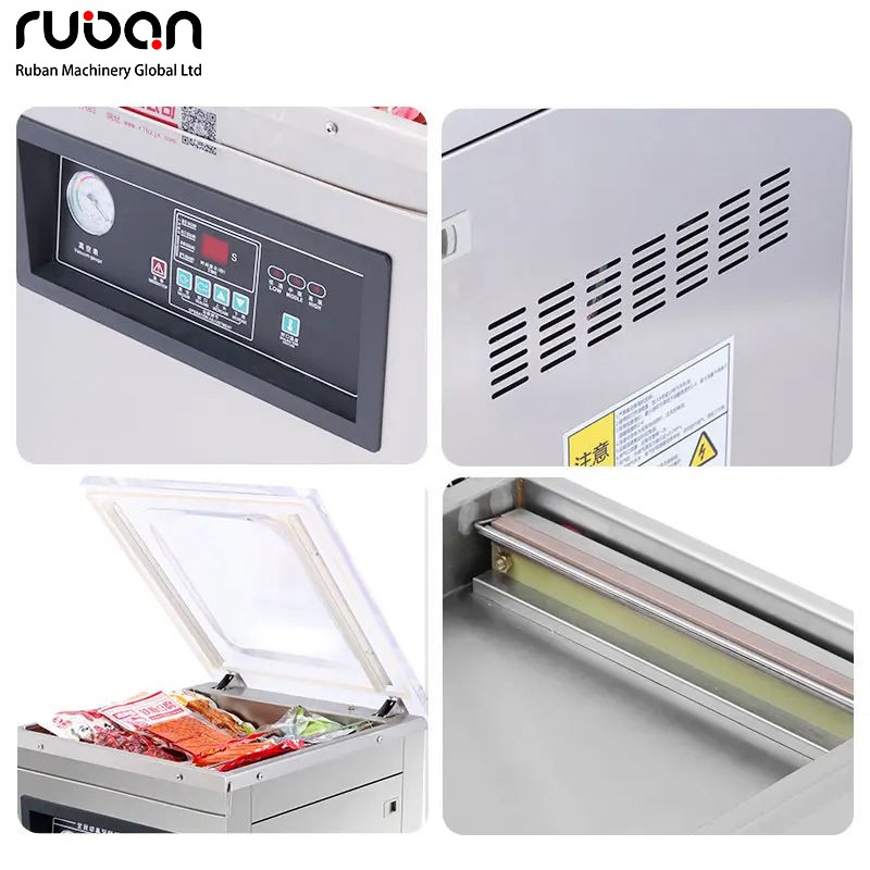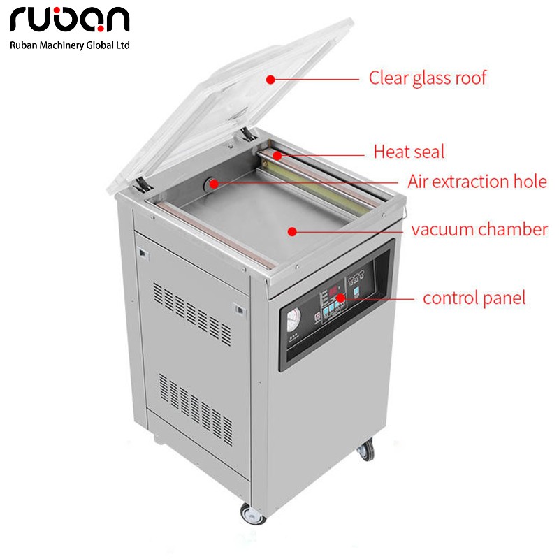 2. Principio de funcionamiento: Introduzca los artículos a envasar en una bolsa de vacío y colóquela en la cámara de vacío. Encienda el equipo a través del panel de control. Primero, extraiga el aire de la cámara de vacío hasta alcanzar el grado de vacío establecido. A continuación, active el dispositivo de termosellado para completar el sellado y así lograr el envasado al vacío de los artículos.
