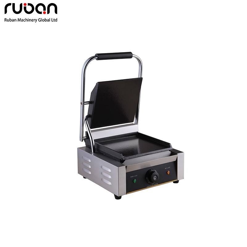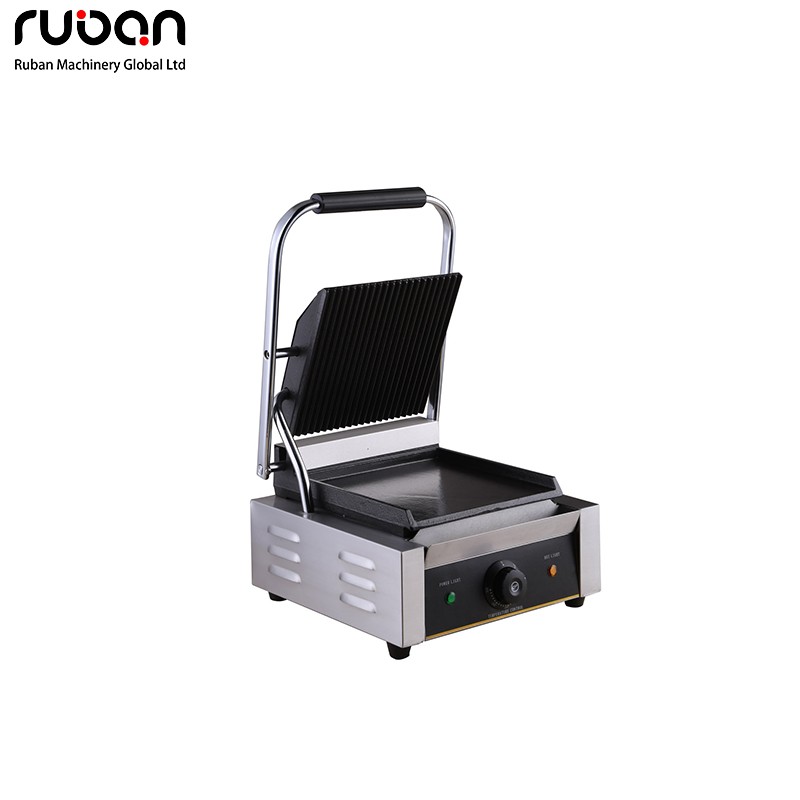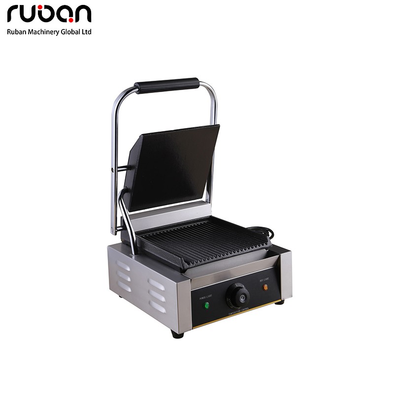 Esta prensa eléctrica comercial para paninis cuenta con una estructura duradera de acero inoxidable y placas ranuradas de hierro fundido de alta resistencia. Equipada con un único mando de control de temperatura de precisión e indicadores luminosos, garantiza una distribución uniforme del calor para dorar a la perfección paninis, hamburguesas, filetes y sándwiches. Su diseño compacto para encimera y su fácil limpieza la convierten en una estación de cocina esencial para restaurantes, cafeterías, food trucks y empresas de catering.