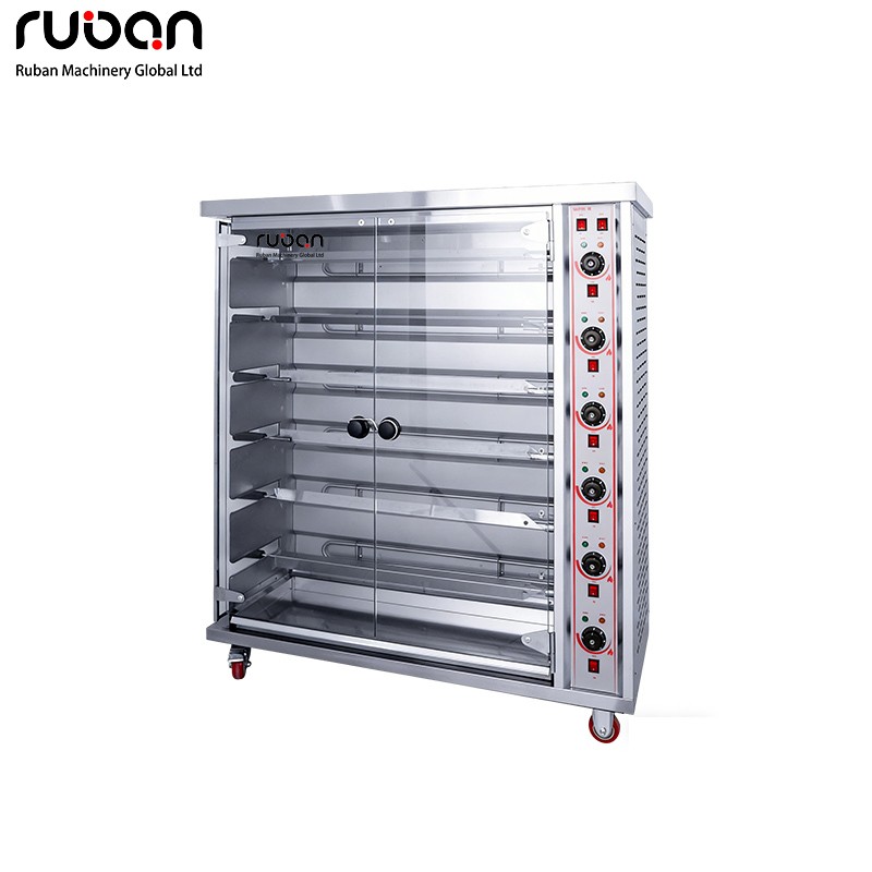 Este horno asador comercial está diseñado para cocinas profesionales. Con múltiples asadores giratorios, controles de temperatura independientes y una puerta de cristal transparente, garantiza un asado uniforme, alta eficiencia y fácil manejo, ideal para cocinar pollo, pato y mucho más en supermercados, charcuterías y restaurantes.