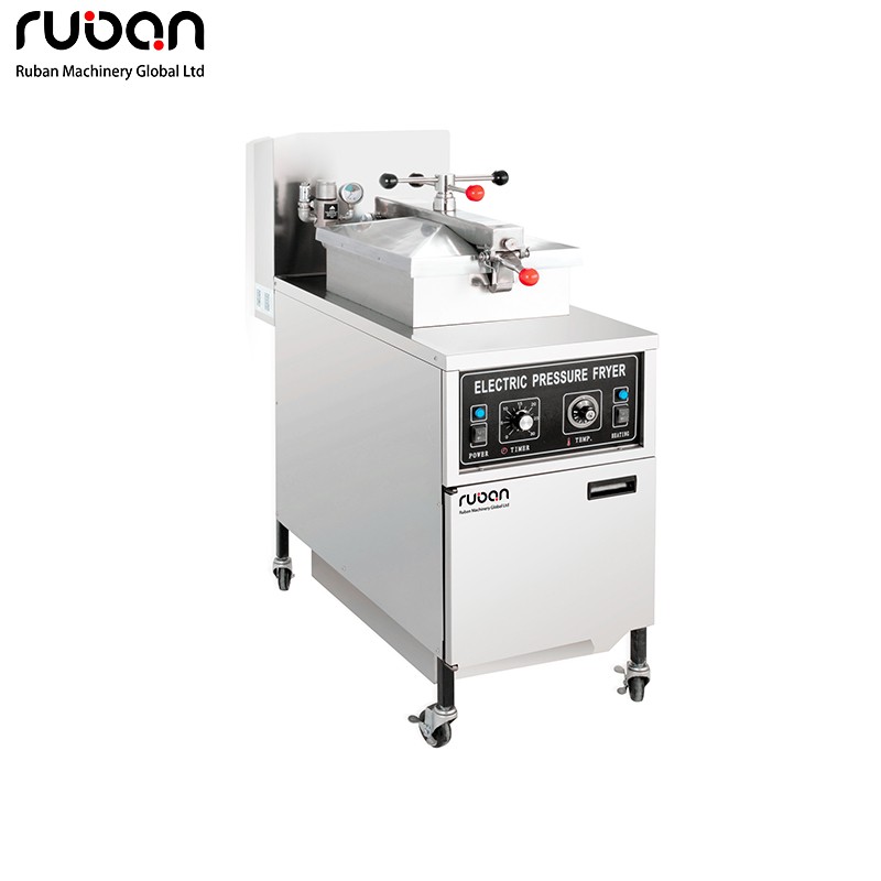 Freidora de pie comercial, tapa de aluminio, robusta y fácil de usar. Equipada con ruedas con freno para facilitar su movilidad, dispositivo de seguridad contra sobrepresión, temporizador eléctrico y protección contra sobrecarga térmica. Válvula de drenaje de aceite fiable, ideal para pollerías y restaurantes.