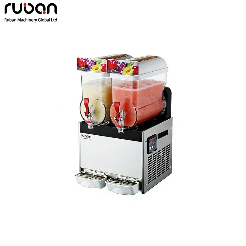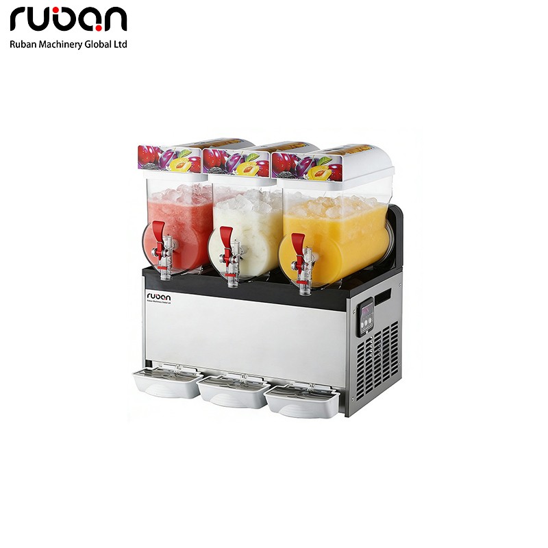 Esta máquina de granizados está disponible en modelos de uno, dos y tres cilindros. Su cuerpo está fabricado principalmente en acero inoxidable, con un depósito de policarbonato transparente equipado con válvulas dispensadoras rojas para un funcionamiento intuitivo y cómodo. El equipo cuenta con un sistema de refrigeración independiente y compresores importados, que ofrecen una alta eficiencia de enfriamiento y permiten preparar granizados en 30-45 minutos. Su estructura de transmisión electromagnética garantiza un bajo nivel de ruido y una larga vida útil. El depósito es resistente a altas y bajas temperaturas, fácil de desmontar y limpiar. La máquina es fácil de transportar y mantener, y resulta ideal para la elaboración de granizados, batidos y otras bebidas en establecimientos comerciales como teterías, cibercafés y restaurantes.