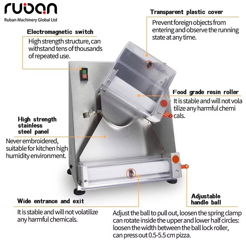 Esta laminadora de masa para pizza de uso comercial está fabricada en acero inoxidable apto para uso alimentario y diseñada para cocinas profesionales. Cuenta con una entrada inclinada para el laminado automático, rodillos ajustables para regular el grosor y dar forma a las bases de pizza redondas, e incorpora medidas de seguridad como cubiertas transparentes, protección eléctrica y protección contra sobrecargas del motor. Para mayor comodidad, está disponible con control por pedal.