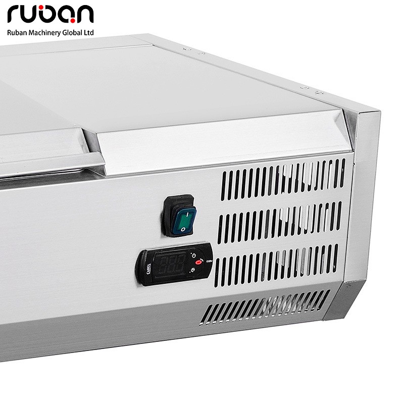 Esta estación refrigerada de sobremesa para ingredientes de ensaladas es un equipo especializado para entornos comerciales como tiendas de comida rápida, restaurantes occidentales y restaurantes de autoservicio. Fabricada en acero inoxidable apto para uso alimentario, integra las funciones de refrigeración y conservación de ingredientes, así como el almacenamiento clasificado. El equipo cuenta con múltiples compartimentos independientes para ingredientes, que permiten almacenar por separado verduras, frutas y salsas. Su tapa abatible sellada evita la entrada de polvo y ayuda a mantener el frío. Gracias a su preciso sistema de refrigeración, proporciona un entorno de baja temperatura para la conservación de los ingredientes. El panel de control de temperatura y la estructura de disipación de calor lateral garantizan una refrigeración estable. Con un diseño compacto y pequeño, es ideal para espacios reducidos como barras y encimeras, siendo una herramienta eficiente para la preparación de ensaladas e ingredientes.