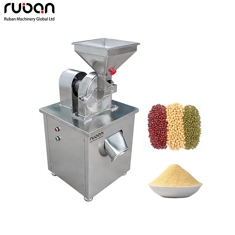 Se trata de un molinillo de granos comercial fabricado en acero inoxidable, con una estructura vertical, una entrada de alimentación en forma de embudo en la parte superior y una salida de descarga lateral. Se exhibe junto a granos como frijoles rojos, frijoles mungo, soja y los productos molidos, lo que refleja claramente su función principal: la molienda de granos.