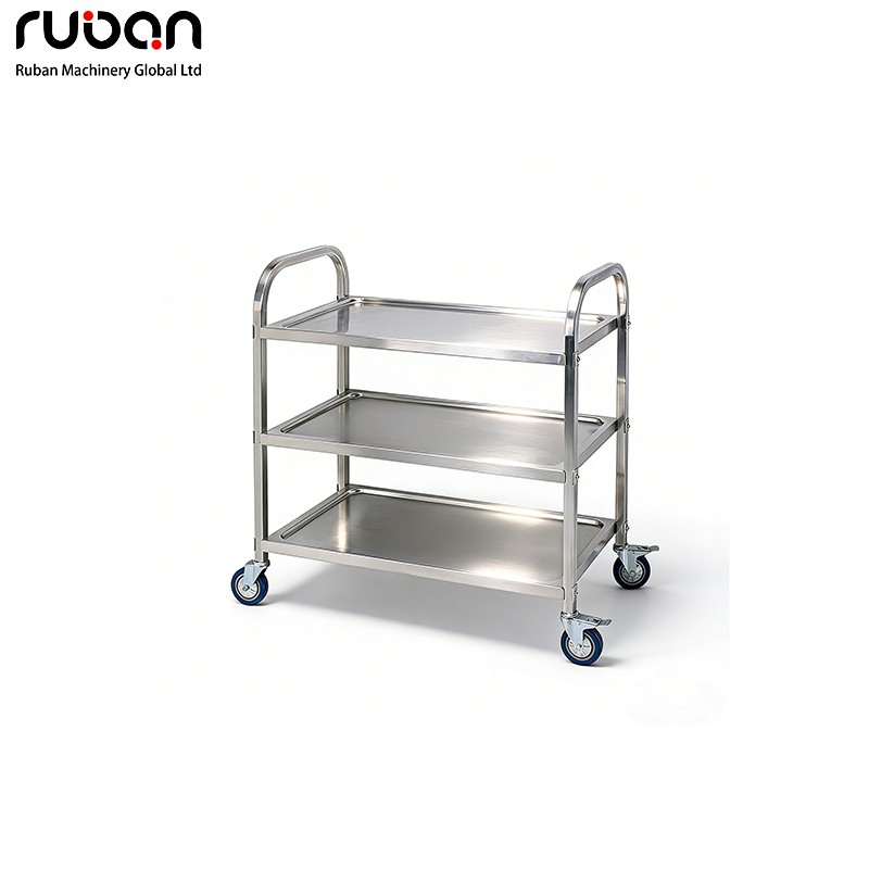 Esta serie de carros de servicio de acero inoxidable incluye modelos con estantes abiertos de tres y dos niveles, todos equipados con ruedas universales, que sirven como equipo básico para el transporte de ingredientes y vajilla en entornos de catering comercial.